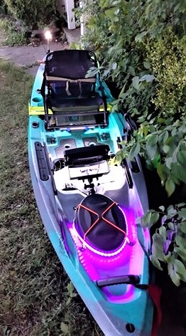 water, you are thankful someone is looking out for you. The most common requirement is the need to have 360 degree safety lights for the early morning hours. A lot of us also like night fishing. A good headlamp is very important for this, but adding deck lights is a really sweet addition, as is a special UV light which can actually attract baitfish and, the predators that seek them. Your first inclination, and it was mine, might be to use a battery powered lantern for the 360 light. It’s cheap, functional, and met the requirement. However, once you have the upgrade bug, I envisioned wiring the lights onto my kayak.